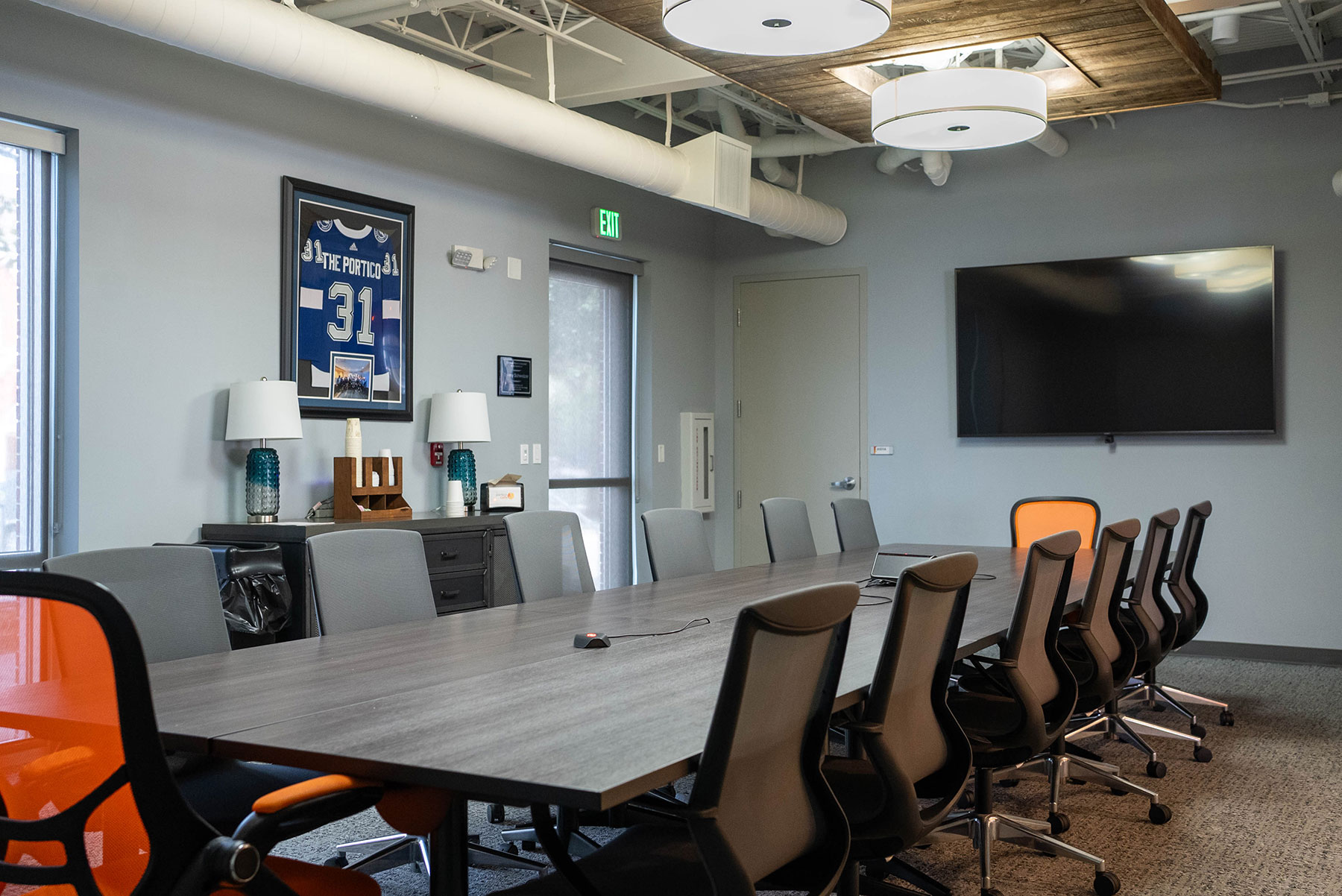 Professional and comfortable meeting space featuring sliding barnyard doors for privacy. Newly renovated space was designed exclusively for business-style meetings featuring: Polycom Audio & Video, 85 inch Smart TV, 3 large Glass White Boards, and excellent WiFi. Seats 12-15.